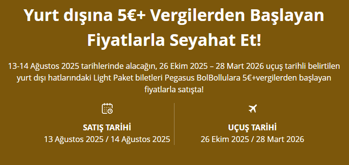 Yaz tatilinin son günleri yaklaşırken, yurt dışı seyahat planı yapanlar için büyük bir fırsat kapıda. Pegasus Hava Yolları, 26 Ekim 2025 ile 28 Mart 2026 tarihleri arasında geçerli olacak yurt dışı uçuşlar için 5 Euro + vergilerden başlayan fiyatlarla bilet satışına başlıyor. Üstelik bu kampanya yalnızca 13 ve 14 Ağustos 2025 tarihlerinde geçerli oluyor.